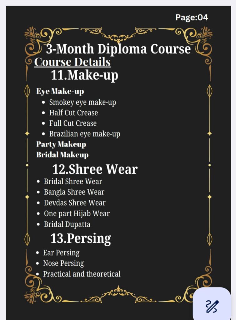 প্রফেশনাল বিউটিফিকেশন কোর্সে ভর্তি চলছে। নুরজাহান বিউটি এন্ড টেকনিক্যাল ট্রেনিং ইনস্টিটিউটে তিন মাস এবং ছয় মাস মেয়াদি প্রফেশনাল বিউটিফিকেশন কোর্সে ভর্তি চলছে। ২০২৫ সালের জানুয়ারি টু মার্চ তিন মাসের কোর্সে ভর্তি চলছে। কোর্সে যে সকল বিষয় গুলো থাকছে :![]()